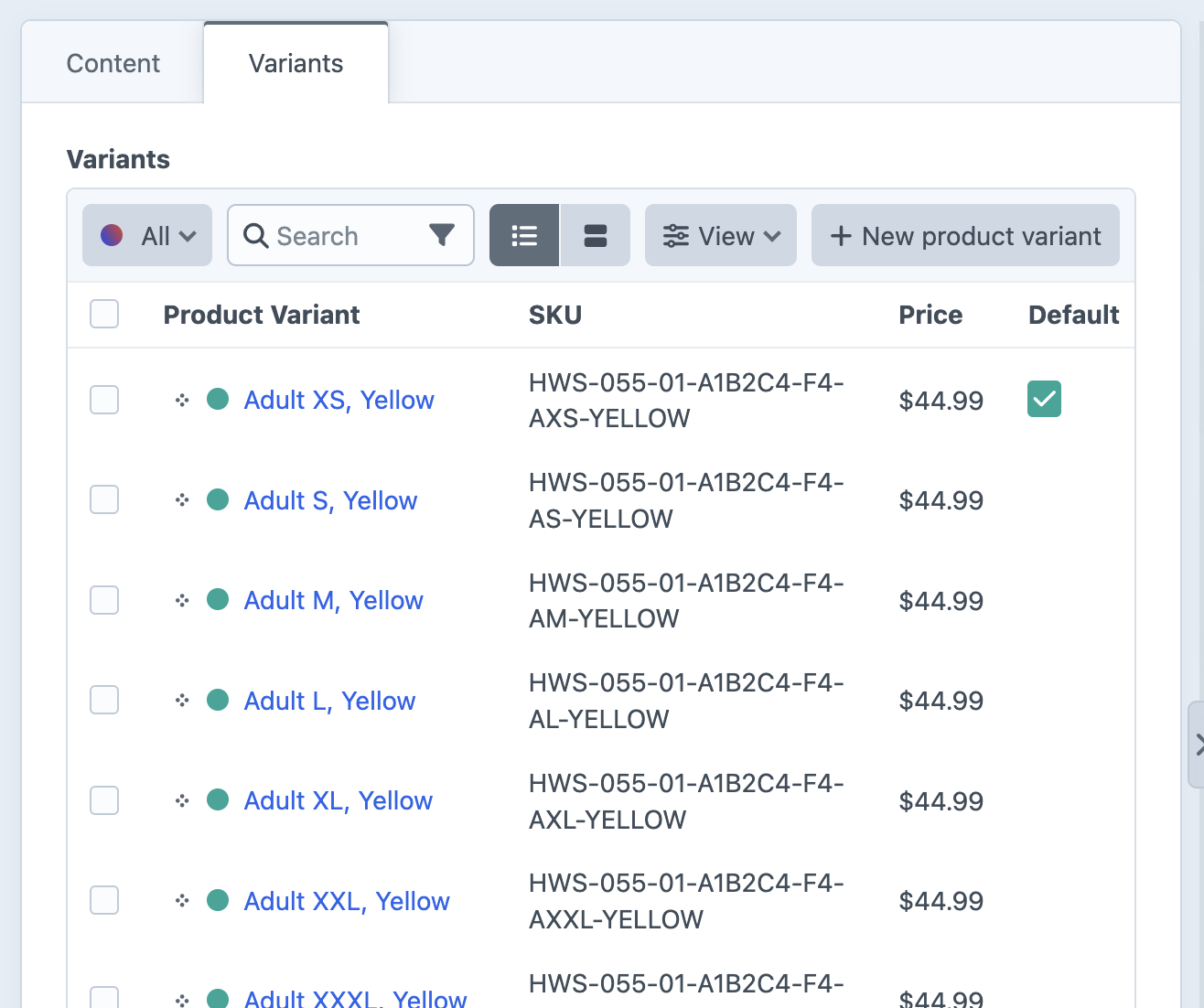 The Craft Commerce UI for creating and editing product variants is suitable for products with a few variants. However, variant management in Craft can quickly become unwieldy when products have twenty or more variations.