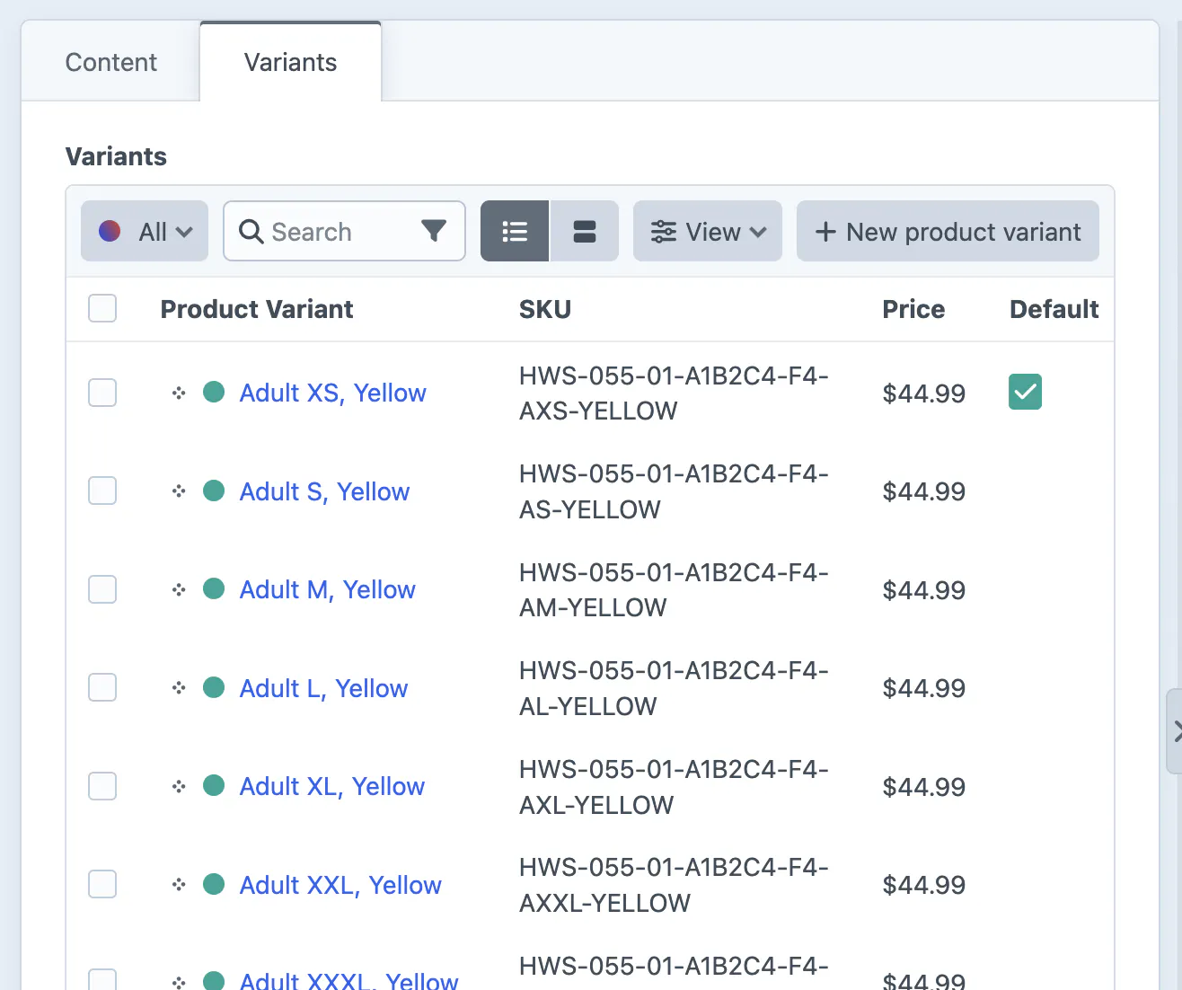 With the hard-coded route, variant option fields instantly become more complex when a company sells a wide variety of products. If, for example, a company sells products that don’t share the same variant options, such as shirts and mugs, the work to manage variant data can quickly multiply.